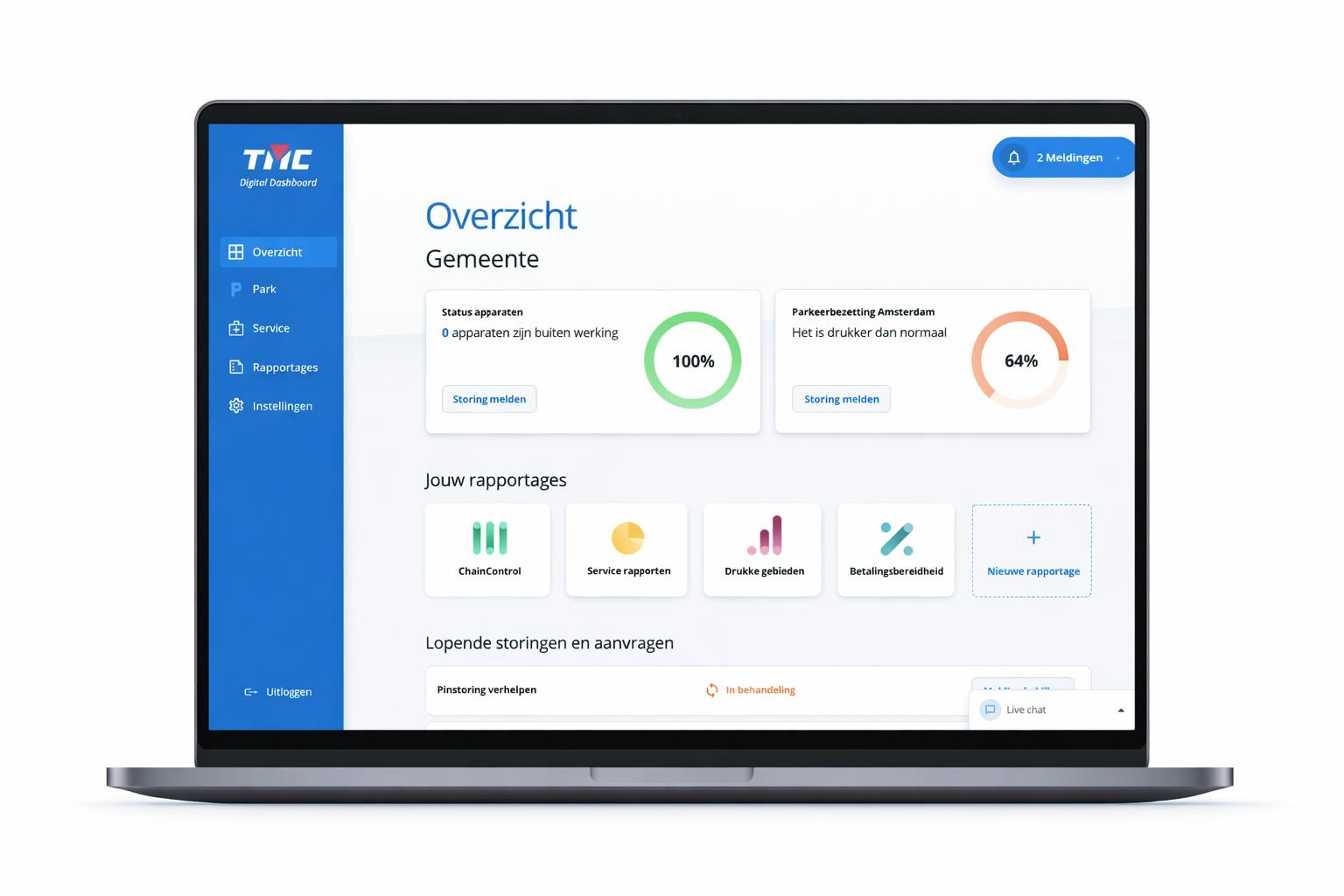 Via een beveiligde login heb je toegang tot duidelijke dashboards en rapportages die je ondersteunen bij zowel dagelijkse monitoring als beleidsmatige keuzes. Meldingen volg je eenvoudig, serviceverzoeken zijn inzichtelijk en belangrijke data is altijd binnen handbereik.